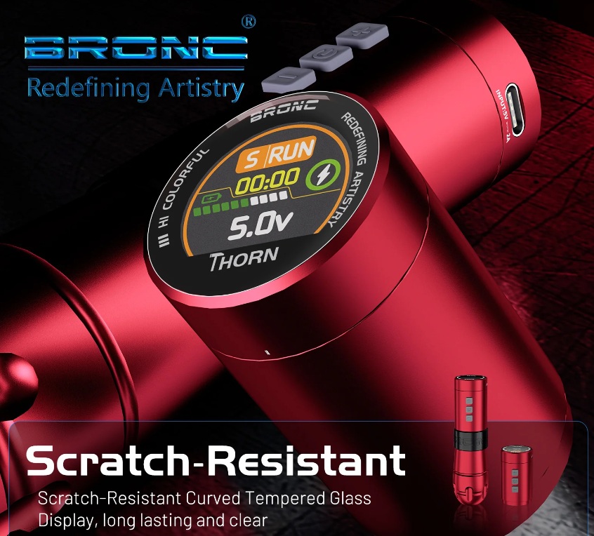 Experimenta un rendimiento inigualable con el lápiz inalámbrico BRONC THORN, diseñado para tatuadores profesionales que exigen consistencia, comodidad y control. Con un potente motor suizo, una carrera de 4,0 mm y una batería de larga duración de 1800 mAh, este lápiz inalámbrico ofrece un funcionamiento fluido y un rendimiento fiable en cada sesión de tatuaje.